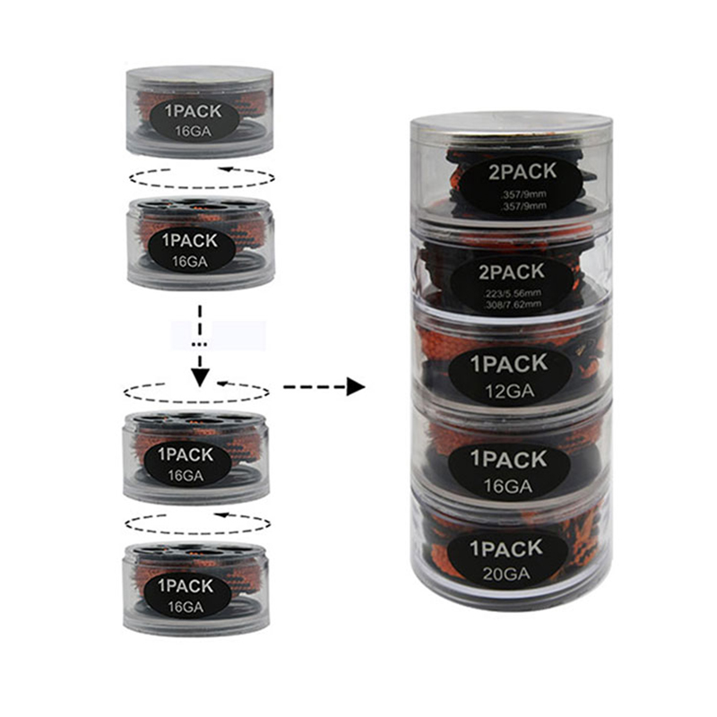 Gun Cleaning Bore Rope Snake Multilayer Pack.DIY.Calibers & Quantities Combination Gun Cleaning Bore snake Ropes Multilayer Συνδυασμός, αυτός ο κύλινδρος πολλαπλών στρώσεων αποτελείται από πολλά σχοινιά καθαρισμού όπλων οπών φιδιών σε διάφορα διαμετρήματα. Είναι βολικό για αποθήκευση και συλλογή. Ο εσωτερικός πυρήνας μπορεί να χρησιμοποιηθεί όχι μόνο ως πυρήνας περιέλιξης σχοινιού, αλλά και ως λαβή έλξης. Μια τέτοια κυλινδρική συσκευασία είναι πιο εύκολο να βρεθεί από μια μεμονωμένη συσκευασία. Το σχέδιο είναι κατοχυρωμένο από την Rotchi.