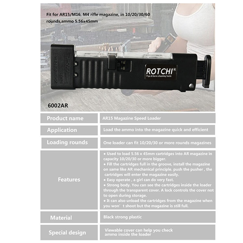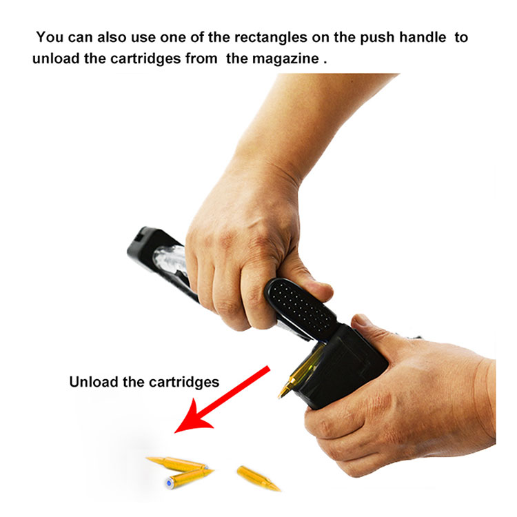 ● Χρησιμοποιείται για τη φόρτωση φυσιγγίων 5,56 x 45 mm σε γεμιστήρα AR σε χωρητικότητα 10/20/30 ή μεγαλύτερη.
