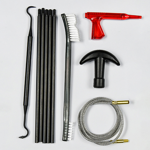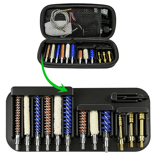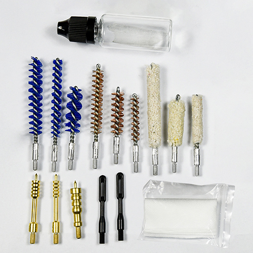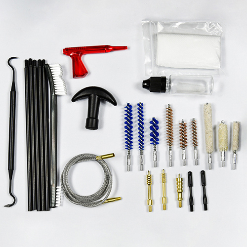 Το κιτ καθαρισμού τουφεκιού και όπλου περιλαμβάνει 3 μεγέθη (.22cal. .30cal. 9mm). Ύφασμα OX επικαλυμμένη θήκη PVC με φερμουάρ. Μπρούτζινες βούρτσες, βαμβακερές σφουγγαρίστρες, νάιλον βούρτσες, ορειχάλκινες οδοντώσεις, 5 καλάμια 1 καλαμπόκι. Άμμος και μαύρο χρώμα για επιλογές.